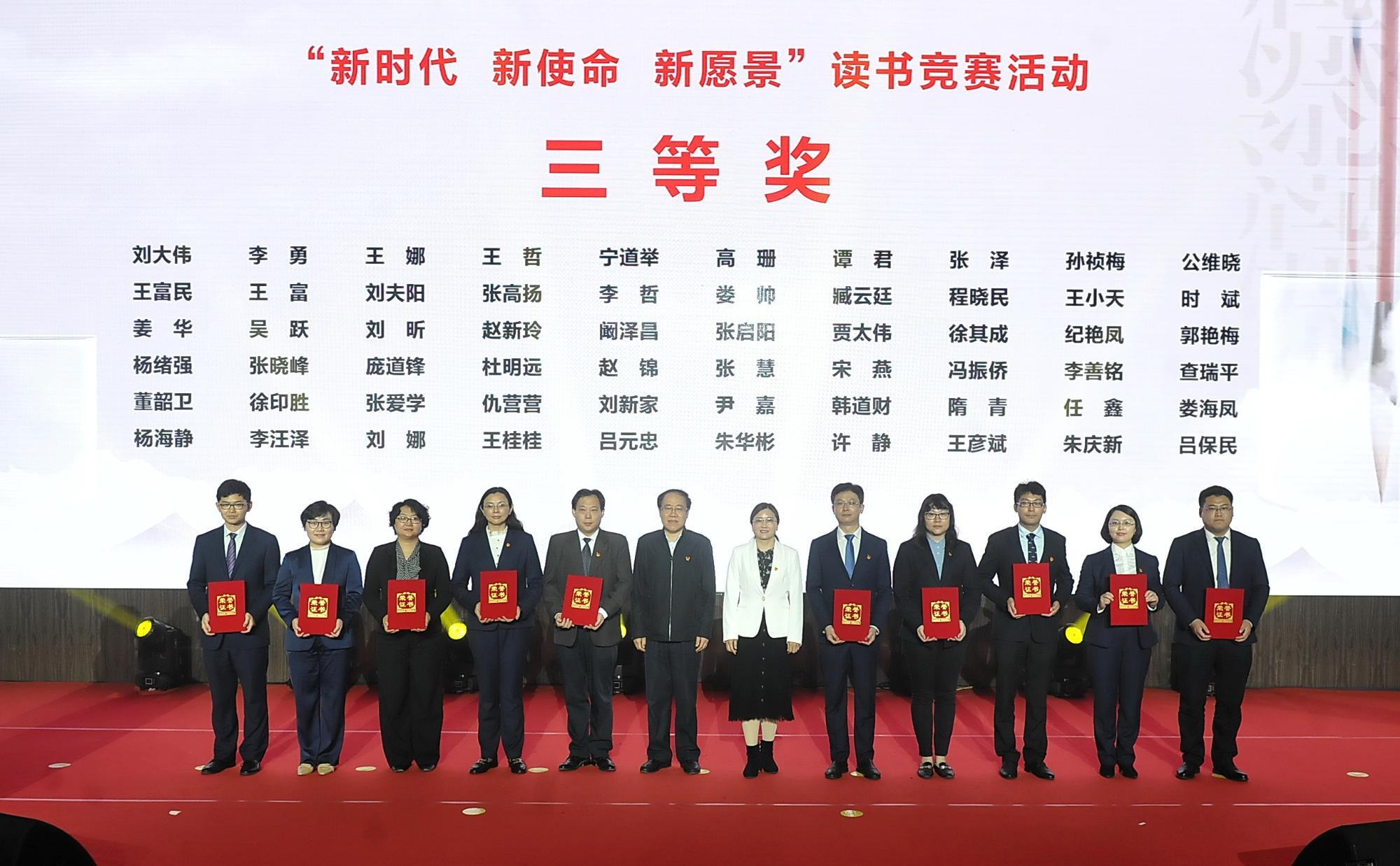 省委党史学习教育领导小组第十五巡回指导组成员、省市场监管局标准化处一级调研员赵秀水,省委党史学习教育领导小组第十五巡回指导组成员、省国资委党委组织与统战工作处副处长、三级调研员庞爱华为获奖代表颁奖。