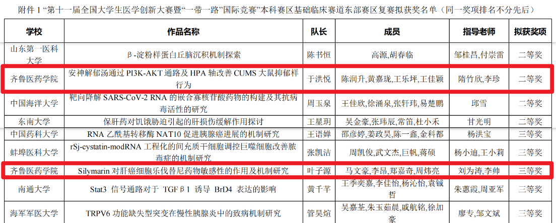 近日,由高等学校大学生医学创新竞赛委员会主办的第十一届全国大学生医学创新大赛暨“一带一路”国际竞赛(以下简称“医创赛”)基础临床赛道东部和北部赛区复赛在山西医科大学顺利落幕。齐鲁医药学院项目《安神解郁汤通PI3K-AKT通路及HPA轴改善CUMS大鼠抑郁样行为》《Silymarin对肝癌细胞乐伐替尼药物敏感性的作用及机制研究》分获二、三等奖。