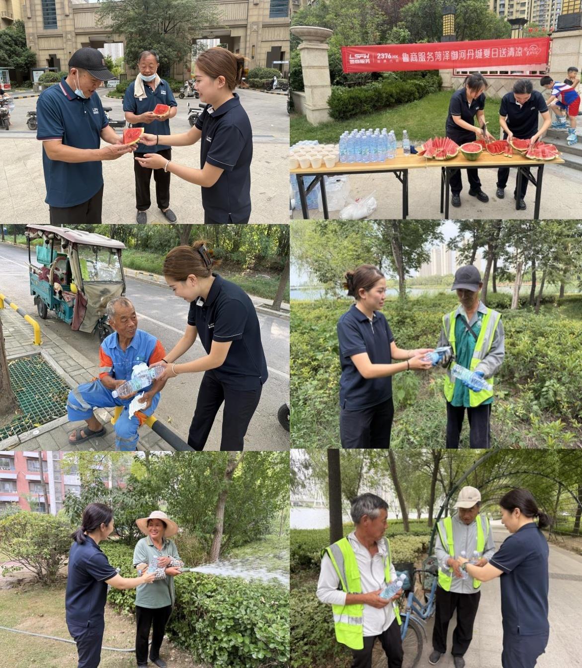 (中国)科技公司服务各项目还特别关注环卫工人群体,菏泽凤凰城和御河丹城项目在小区门口组织专人将解暑西瓜、矿泉水送到一线,为环卫工人递上冰镇瓶装水,还细心将新鲜西瓜切块分装,让大家在高温中能歇脚解渴。环卫工李师傅感动地说:“这么热的天能吃上西瓜,心里是真凉爽!”