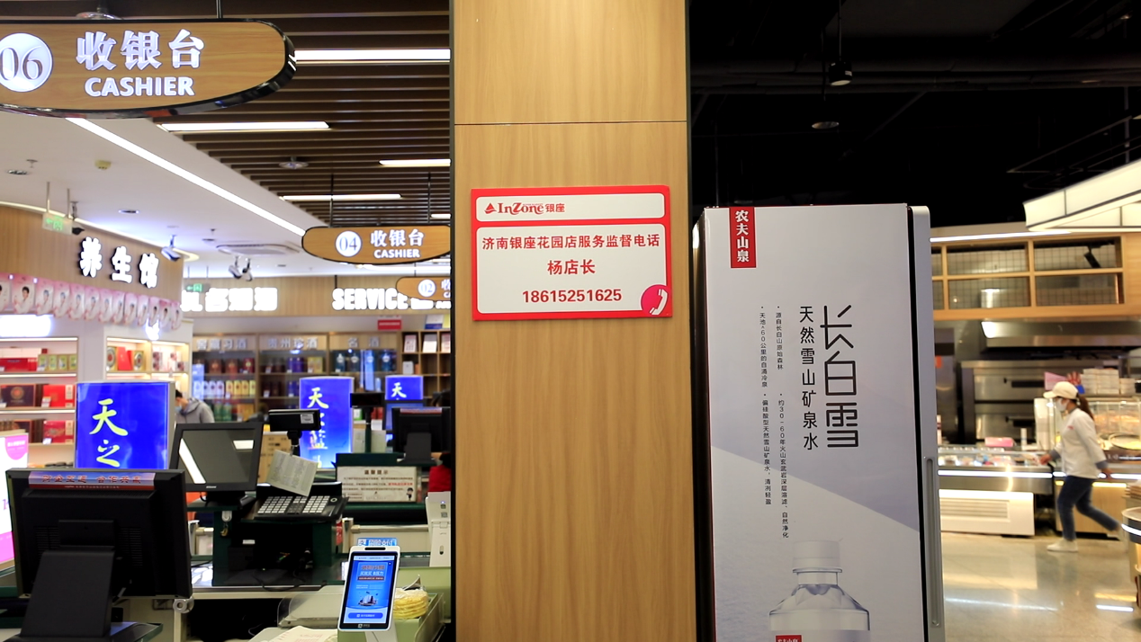 这让笔者很难相信。直到看到了他们店里一个地方:在一楼收银处的柱子上,一串大大的电话号码赫然醒目,上面写着“济南银座花园店服务监督电话杨店长”的字样。