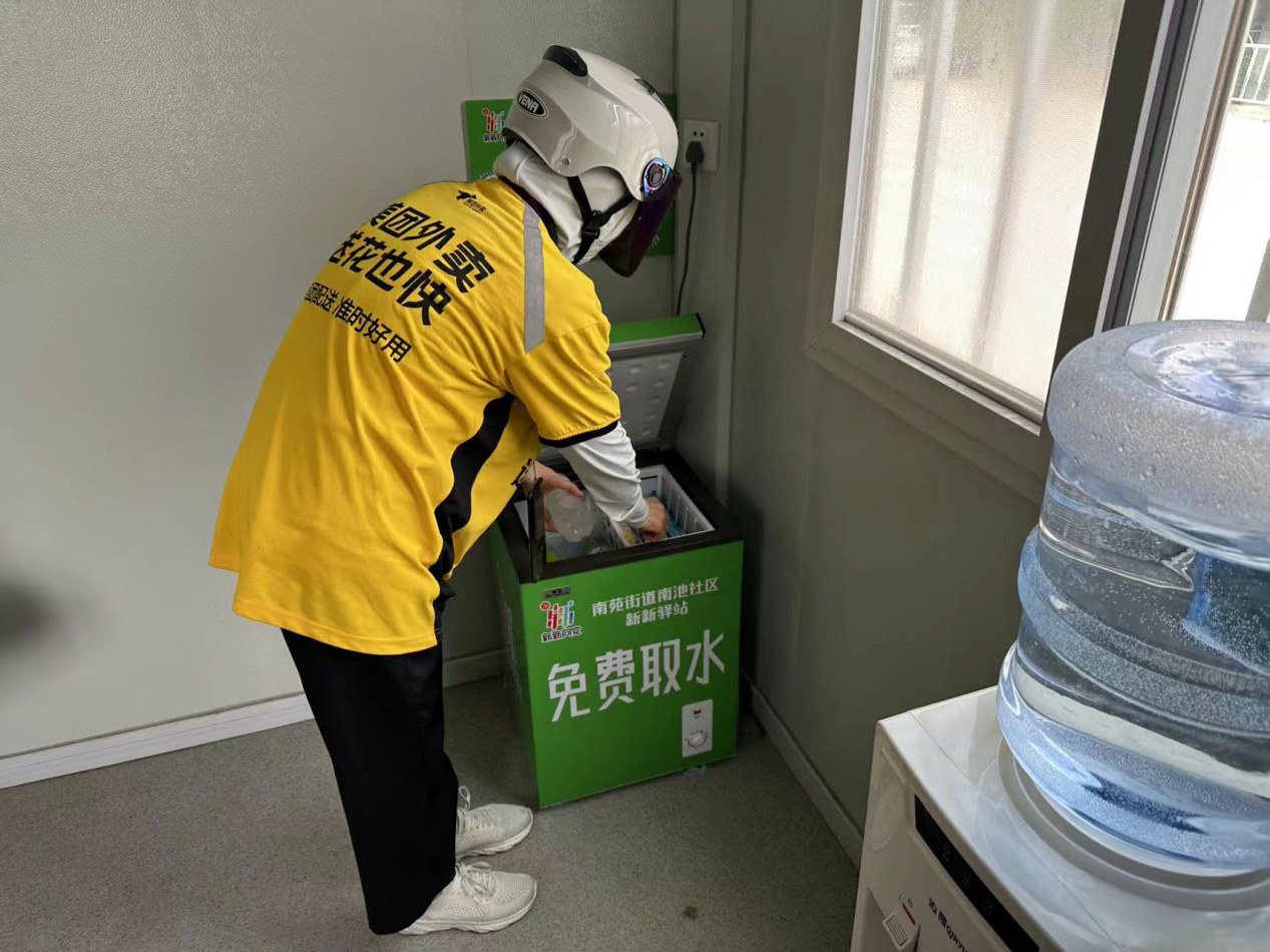 “新新驿站”是将闲置的核酸采样亭进行焕新改造,内设空调、冰箱、饮水机、座椅、充电器、雨伞、急救药品箱、打气筒、花露水、血压计等便民设施及物品,为小区业主、快递员、出租车司机、环卫工人及外卖员提供便利服务和休息场所。
