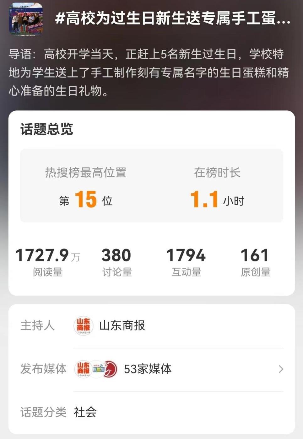 学校还为9月9日集中报到日当天过生日的学生送上了生日蛋糕,蛋糕由西餐学院的老师亲手制作,并刻有过生日学生的名字,相关视频经媒体报道后迅速登上烟台同城热搜第1位,全国热搜第15位,浏览量超2000万。