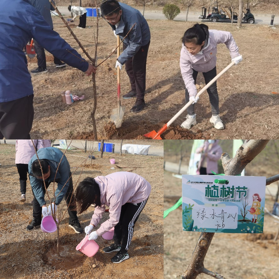 在义务植树活动中,全体党员两三个人一组,铲土、定植、栽种、浇水,大家分工明确、配合默契,合力栽下一棵棵杏树,为济南的春天增添绿色和生机。