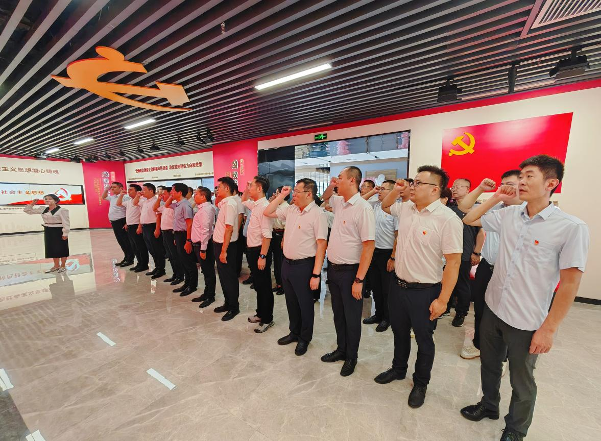 在教育基地,全体党员面对鲜红的党旗,庄严重温入党誓词。全员沉浸式参观了全国首个“时代先锋—5G高新视频党史教育展厅”,亲身体验了用可视化技术、幻影场景展现的“云上长征路”“天坑开路人”等内容,现场“穿越时空”,身临其境感悟革命精神,体验更加入心入魂的党建创新学习方式。