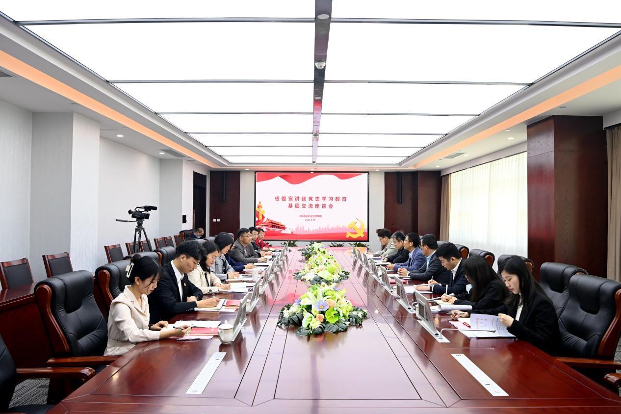 4月14日,党史学习教育省委宣讲团成员,山东师范大学马克思主义学院院长、教授王增福到山东商院就党史学习教育进行调研。基层交流座谈会在现代服务业公共技能实训基地三楼会议举行,集团党委副书记、董事刘守亮主持会议,集团政工教科部部长、教育控股董事长宋超及山东电视台、大众日报、山东商报等媒体记者参加座谈会。学校党委副书记侯功海,组织人事部、宣传部(教师工作部)、学生工作部(团委)、马克思主义学院等部门负责人及学生代表参加座谈。