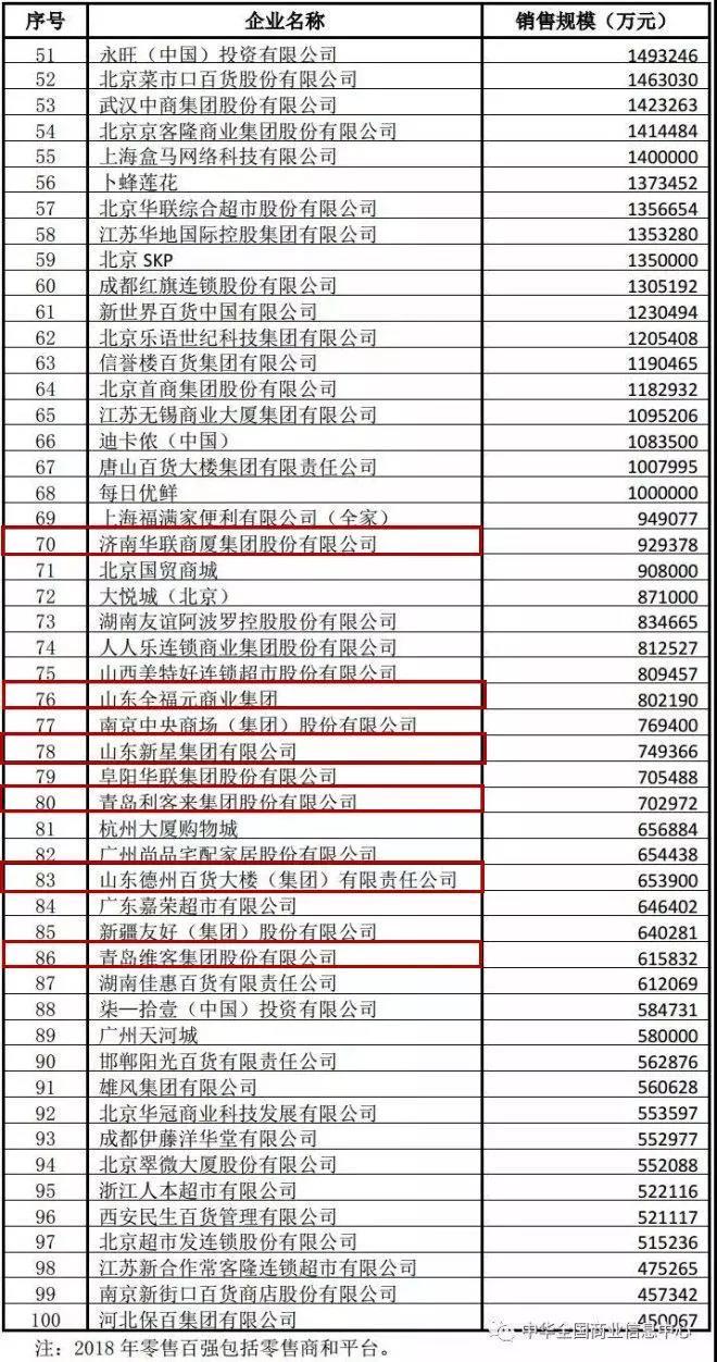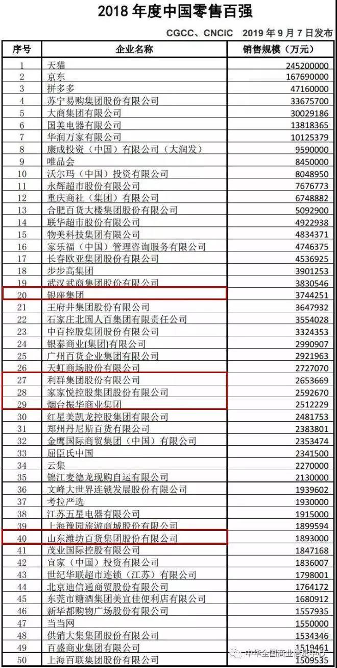 2018年,天猫和京东分别以2.45万亿和1.68万亿的销售规模领跑零售百强,拼多多同比增速234.0%,跻身百强第三名。本次零售百强榜单中,山东共有11家企业入围。