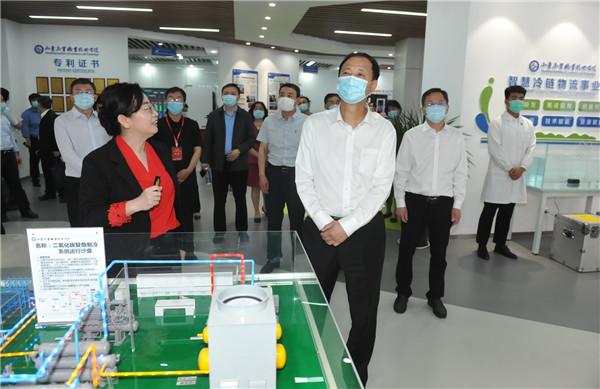 孙尧一行首先来到山东商院商贸流通服务基地,学校相关负责人汇报了校企对接、让老师和学生“把论文写在山东大地上”的故事。听取该校“科研+教研+服务”一体化教学模式以及所产生的成果汇报后,孙尧表示赞许。