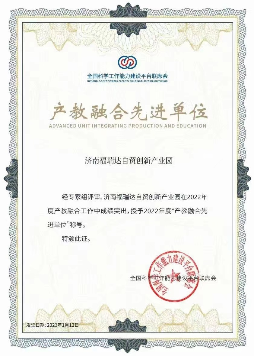 近日,济啤集团福瑞达自贸创新产业园被全国科学工作能力建设平台联席会授予2022年度“产教融合先进单位”荣誉称号。