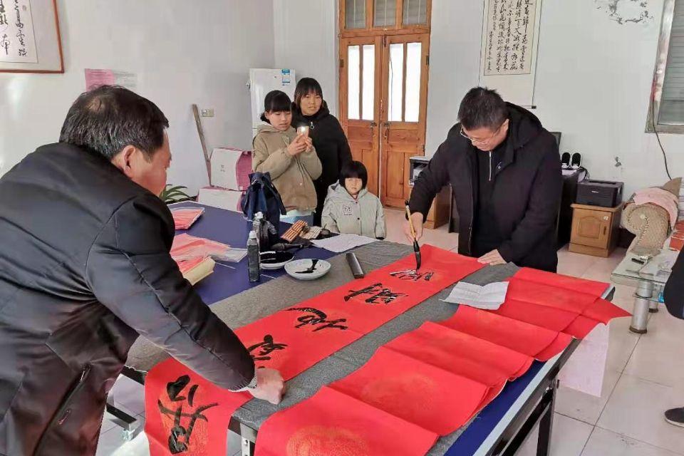 在座谈、走访的同时,学校还组织了书法爱好者,为村民义务书写100余幅春联和“福”字,受到村民的好评。