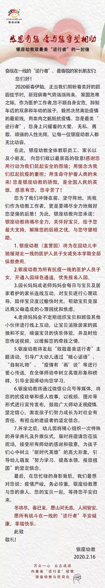 2月16日,银座幼教发布“致最美‘逆行者’的一封信”——《感恩有您 愿与您守望相助》。银座幼教(直营园)将为在园幼儿中驰援湖北一线的医护人员子女减免本学期全部保教费用。同时,还将为所有战疫一线的医护人员子女开通入园绿色通道,优先报名入园。