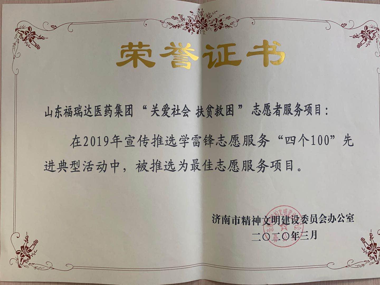 近期,福瑞达“关爱社会、扶贫救困”志愿服务项目在2019年度宣传推选学雷锋志愿服务“四个100”先进典型中,被推选为“济南市最佳志愿服务项目”。