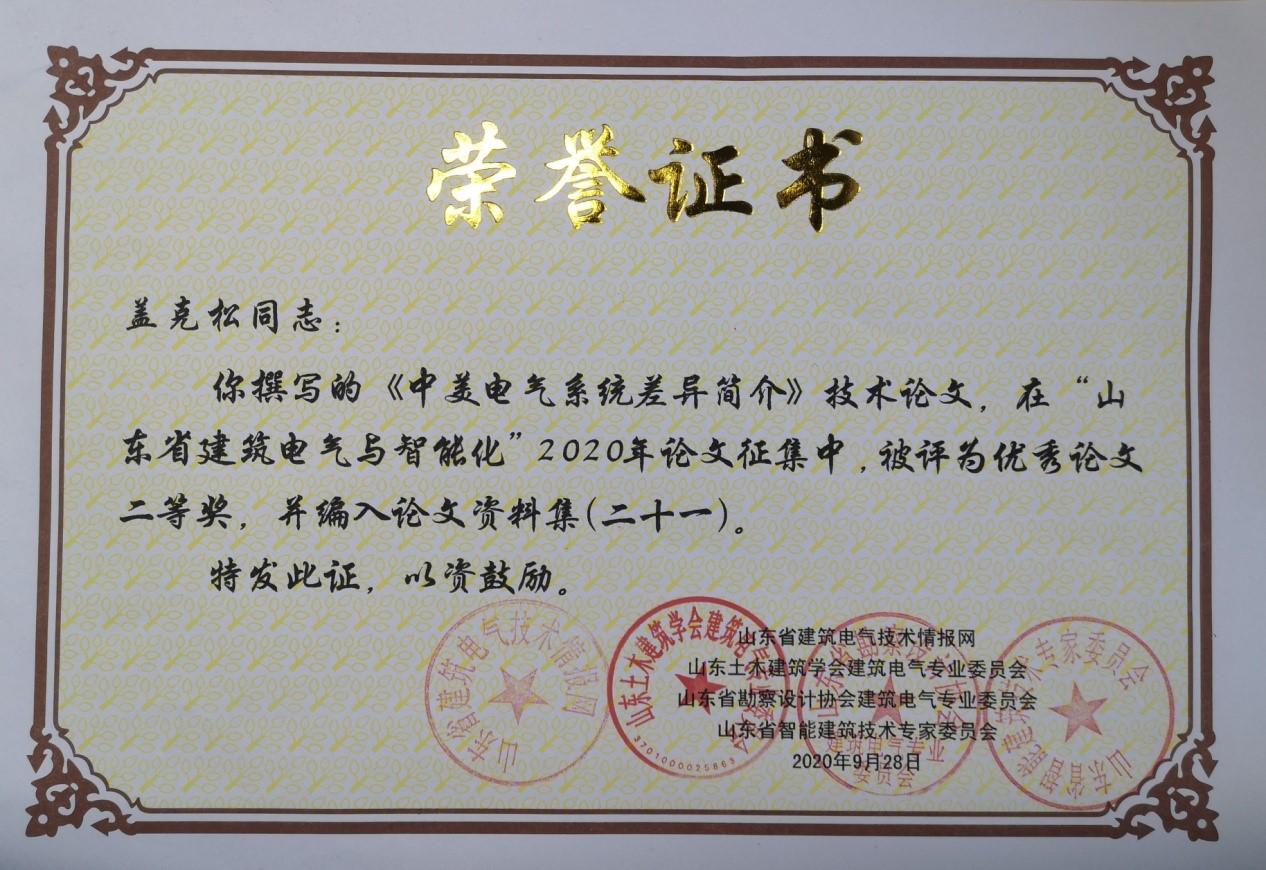 近日,由(中国)科技公司发展所属(中国)科技公司设计院盖克松、赵炜两位同志撰写的技术论文《中美电气系统差异简介》在山东省建筑电气与智能化2020年论文征集评选活动中受到评审专家的一致好评,被评为优秀论文二等奖,并编入论文资料集。