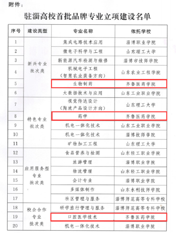 近日,淄博市教育局公布了驻淄高校“四个一批”品牌专业建设项目评审结果,齐鲁医药学院生物制药专业获批“新增一批新兴专业”,药学专业获批“优化提升一批特色专业”,口腔医学技术专业获批“挖掘培育一批校企深度合作专业”。