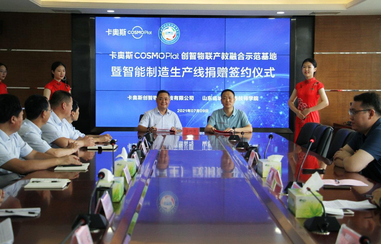 7月9日,省城市学院与海尔卡奥斯COSMOPlat创智物联产教融合示范基地揭牌暨智能制造生产线捐赠签约仪式举行。学院党委副书记刁洪斌,卡奥斯创智物联科技有限公司青岛工厂总经理高广伟出席签约仪式。