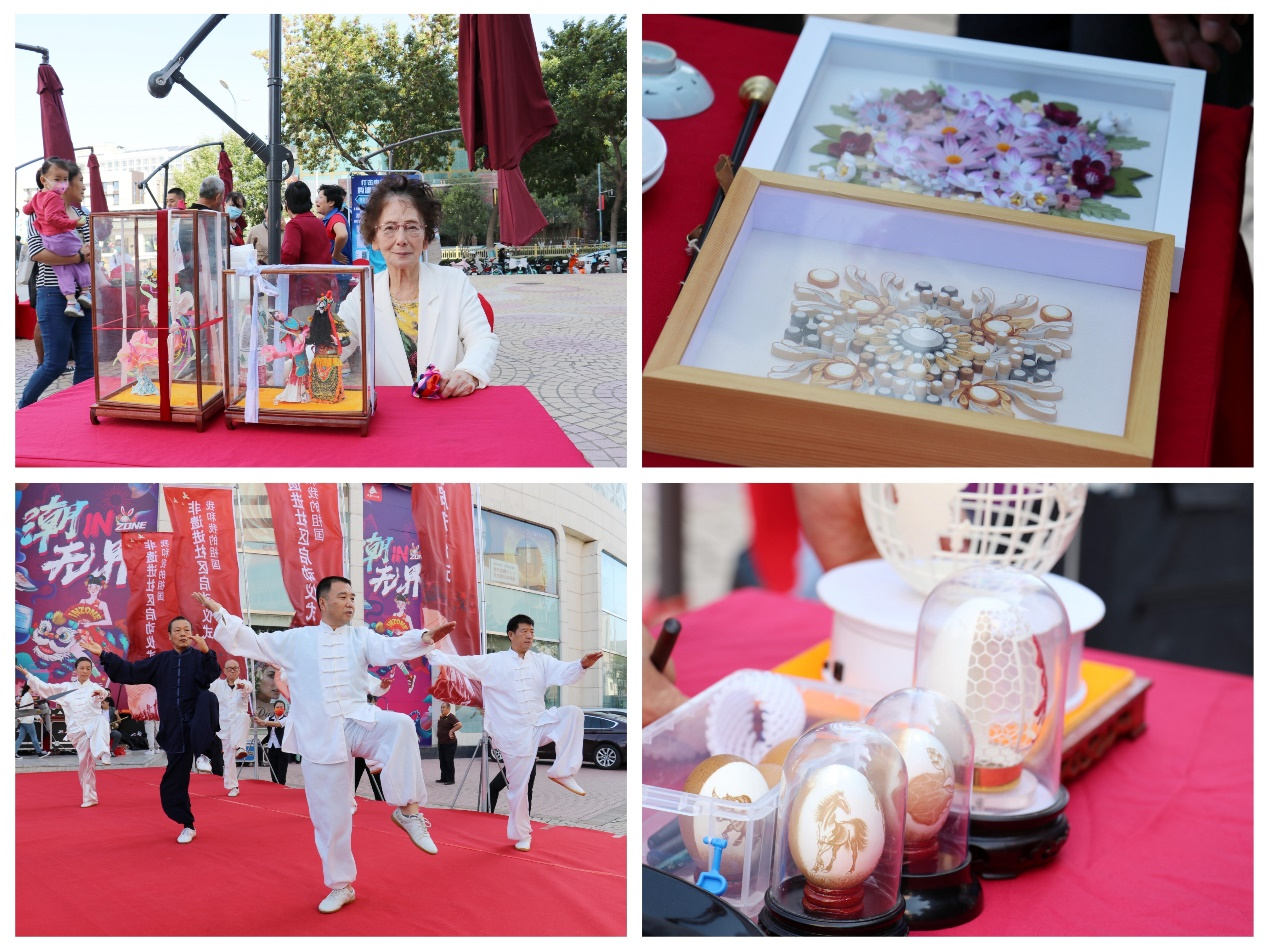 活动现场展示了内画鼻烟壶、鲁绣、钩针编织、口金包制作、盘纸、大漆、锔艺、面塑、泥塑、桥氏木作、旗袍等非遗工艺品及技艺,内容精彩,形式丰富,社区居民驻足观看、啧啧称奇。