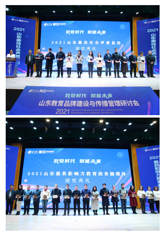 12月24日,2021山东教育品牌建设与传播管理研讨会在泰安召开,会上发布“2021山东最佳社会声誉高校”和“2021最具影响力教育政务融媒体”两大榜单,青岛酒店学院再次获评2个奖项。