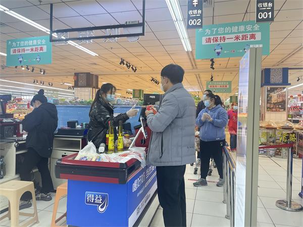 门店严格执行全方位、全流程消杀工作,坚决不留一个死角,门店入口处放置免洗消毒凝胶、酒精、一次性手套、口罩等防护物资,并在冷链商品等陈列区域为顾客配备消毒用品及一次性挑选商品的手套;增加防疫监测人员,专人负责测温、验码工作;进一步细化人员排查与管理工作方案,并做好台账记录,坚持不懈筑牢织密疫情防控坚固防线。