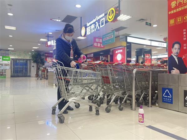 银座集团将继续严格落实疫情防控相关要求,全面有序做好疫情防控时期的市场供应,保障市民基本生活物资供应,共克时艰。为保证购物环境安全卫生,超市防损员每天为150余辆购物车及200个购物篮定时消毒,确保没有任何遗漏;保洁员严格执行卖场地面、扶梯扶手、洗手间、办公区等区域每日3次消毒工作。