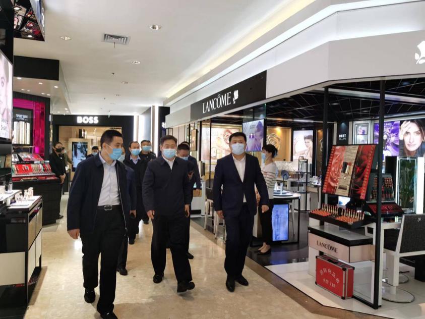 4月13日,临沂市副市长、市公安局局长任泽龙一行到银座集团临沂商城店督导防疫保供工作,临沂商城店总经理李振湖陪同。