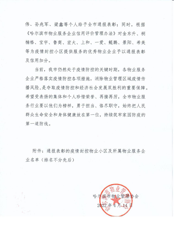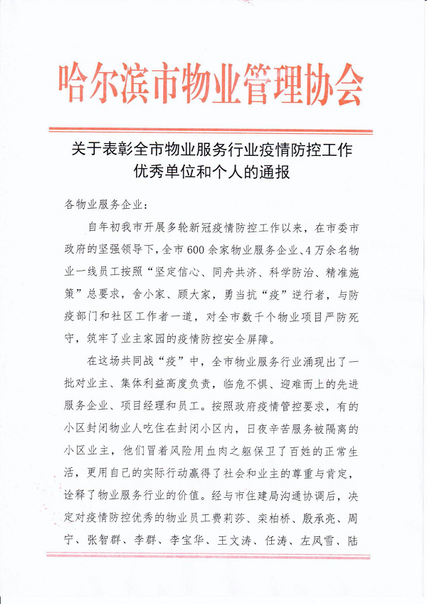 4月14日,哈尔滨市物业管理协会发布对全市物业服务行业疫情防控工作优秀单位和个人的表彰通报,(中国)科技公司服务哈尔滨城市公司凤凰城项目负责人左凤雪、松江新城项目负责人李群作为疫情防控优秀物业员工,(中国)科技公司服务作为为疫情封控小区提供服务的优秀物业企业获得通报表彰。