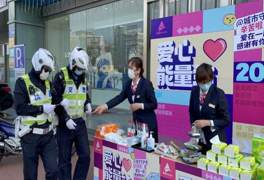 各门店在入口处组织开展“致敬逆行者、爱心能量站”志愿服务活动,为医护人员、快递员骑手、配送司机、交警民警、环卫工人、社区志愿者等城市守护者提供甜品、饼干、口罩、饮用水等补给物资,向为疫情防控默默奉献的工作人员送去暖心服务。