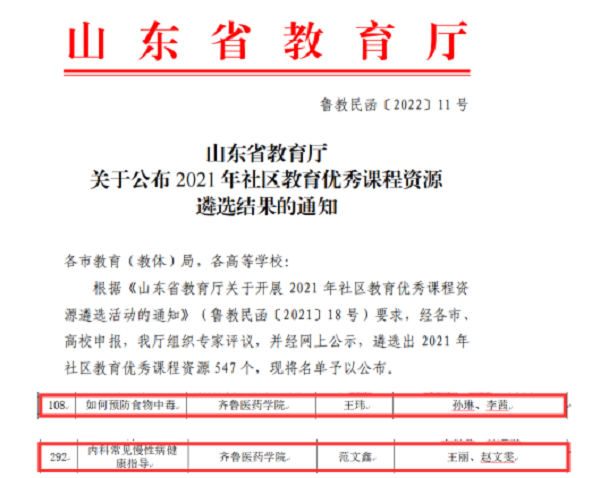 近日,省教育厅公布2021年社区教育优秀课程资源遴选结果,齐鲁医药学院《如何预防食物中毒》《内科常见慢性病健康指导》2门课程被评为优秀课程资源。省教育厅拟将其推介到国家终身教育智慧教育平台。