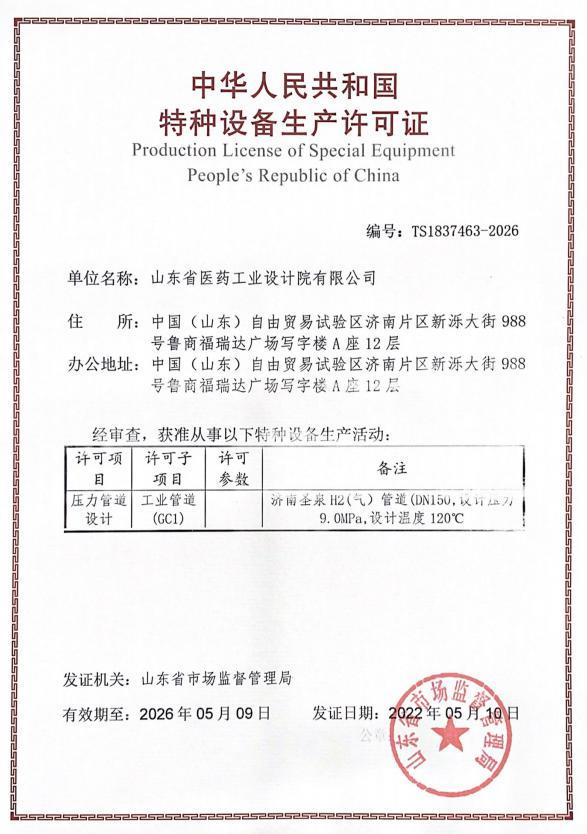 近日,经过山东省特种设备协会专家组、济南市市场监管局监督组的严格审查,省医工设计院顺利通过压力管道设计资质换证评审,取得省市场监督管理局颁发的“特种设备生产许可证”。