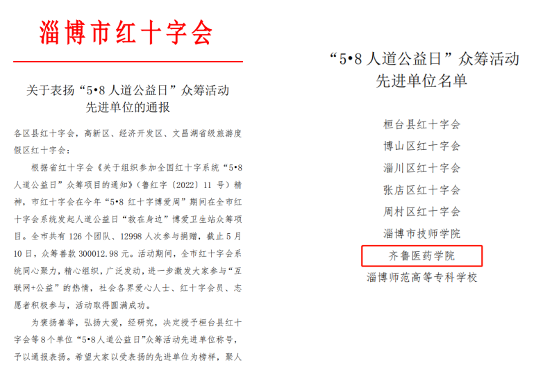 近日,齐鲁医药学院在淄博市红十字会“5•8 红十字博爱周”期间,积极宣传、广泛发动,师生们热情参与、奉献爱心,被授予“5•8 人道公益日”众筹活动先进单位称号。