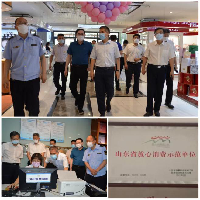 近日,省市监局一级巡视员朱坤峰一行到银座济宁商城店调研放心消费创建、消费维权服务站规范化建设等工作,济宁市副市长张东,任城区委副书记、区长宋华东,济宁市市监局党组书记、局长候典峰,任城区政府副区长孔繁华,任城区市场监管局党组书记、局长陈伟陪同。