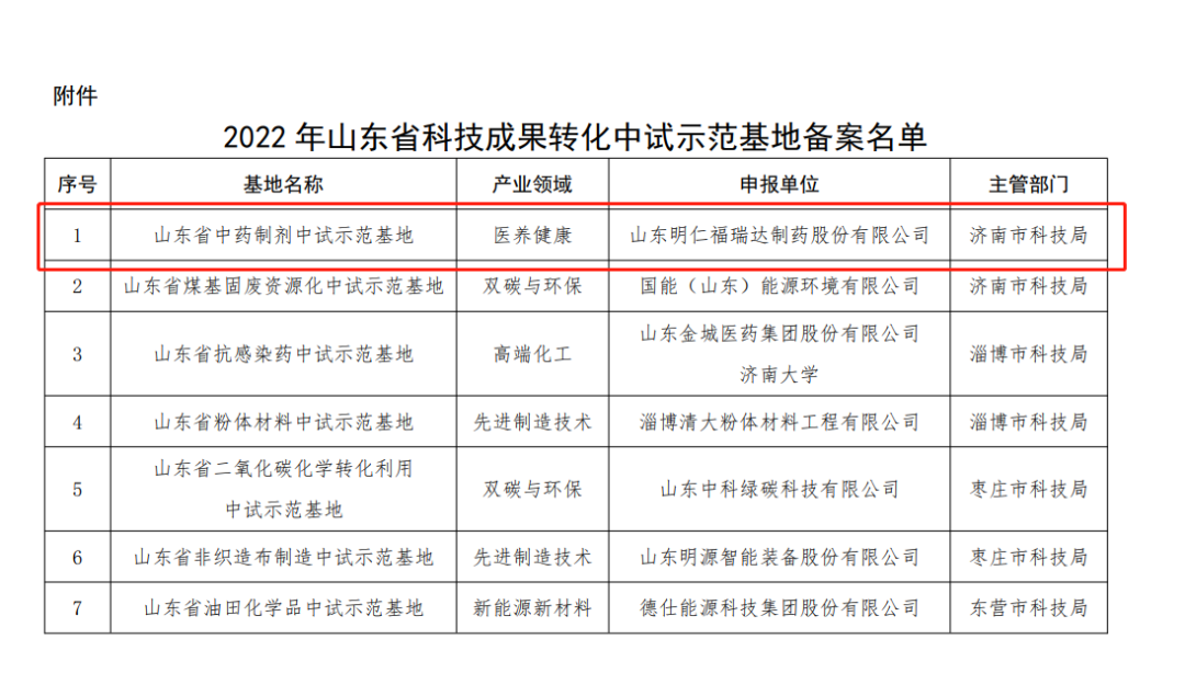 近日,省科技厅公布2022年度山东省科技成果转化中试示范基地备案名单,集团旗下明仁福瑞达从100多家申报单位中脱颖而出,成功获批山东省中药制剂中试示范基地。