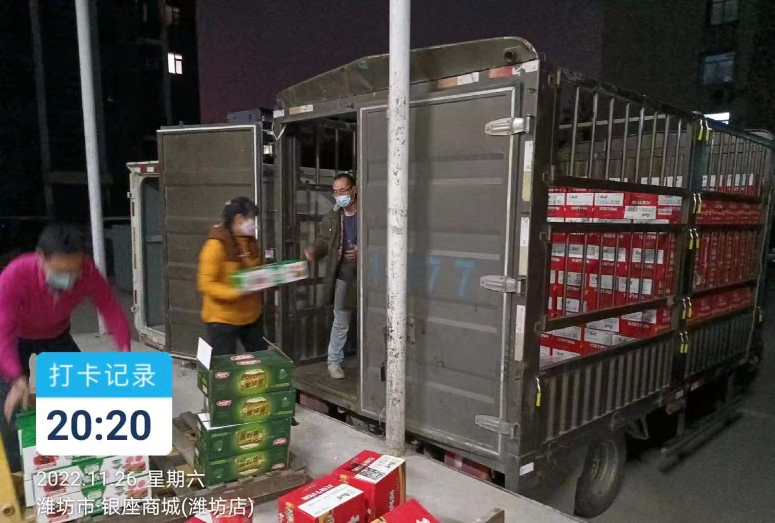 11月26日晚,银座潍坊区域门店获悉潍坊市高新区某重点企业有物资需求,第一时间与该企业取得联系。此时距离闭店仅剩不到10分钟,为保障物资及时送达,门店立即联系配送中心潍坊仓联动配合,协调车辆将紧急调拨的340箱桶装方便面与4000多根火腿肠送达客户指定地点,以“银座速度”高效解决顾客物资急需问题。