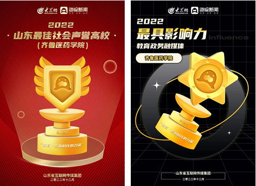 12月16日,由山东省互联网传媒集团大众网·海报新闻发起的“教育·影响时代的力量”年度评选结果出炉,齐鲁医药学院获得“2022山东最佳社会声誉高校”和“2022山东最具影响力教育政务融媒体”两大奖项。