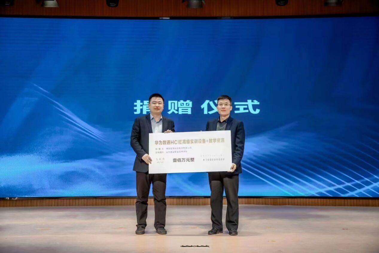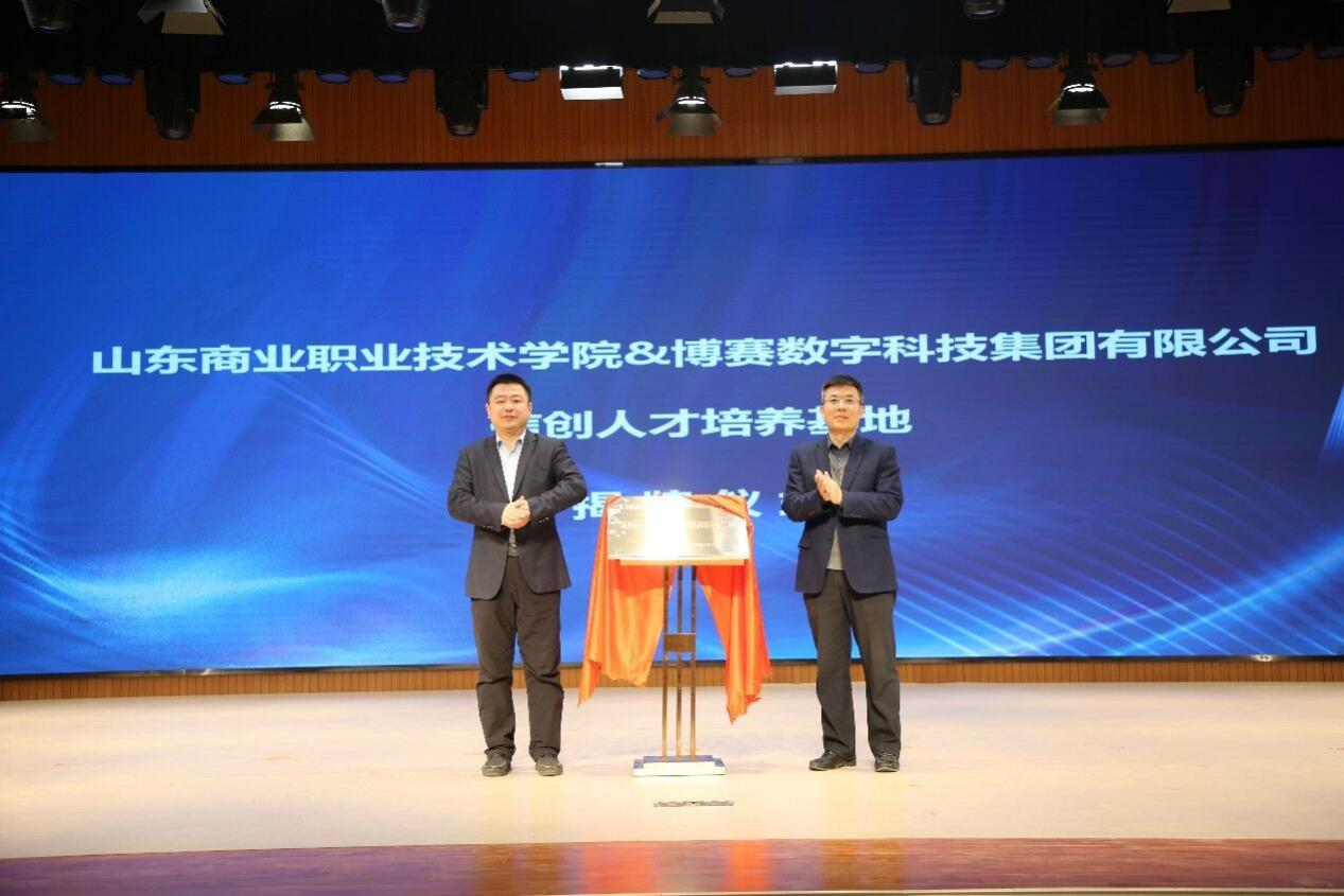 学院党委副书记宋超与董良共同为校企共建信创人才培养基地揭牌。博赛数字科技集团(山东)有限公司捐赠价值100万元的数通高级认证实训设备和教学资源推进基地建设。