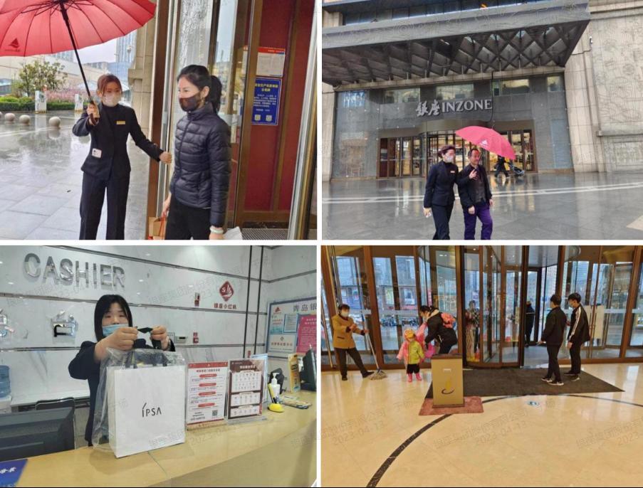 下雨天气,青岛商城店为滞留门口避雨的顾客主动撑伞,护送其至公共交通站点;在各出入口铺设防滑地垫、配置伞套机、防水袋,方便顾客包装湿伞,并安排保洁人员持续清洁地面,以细节服务保障消费者进出安全。