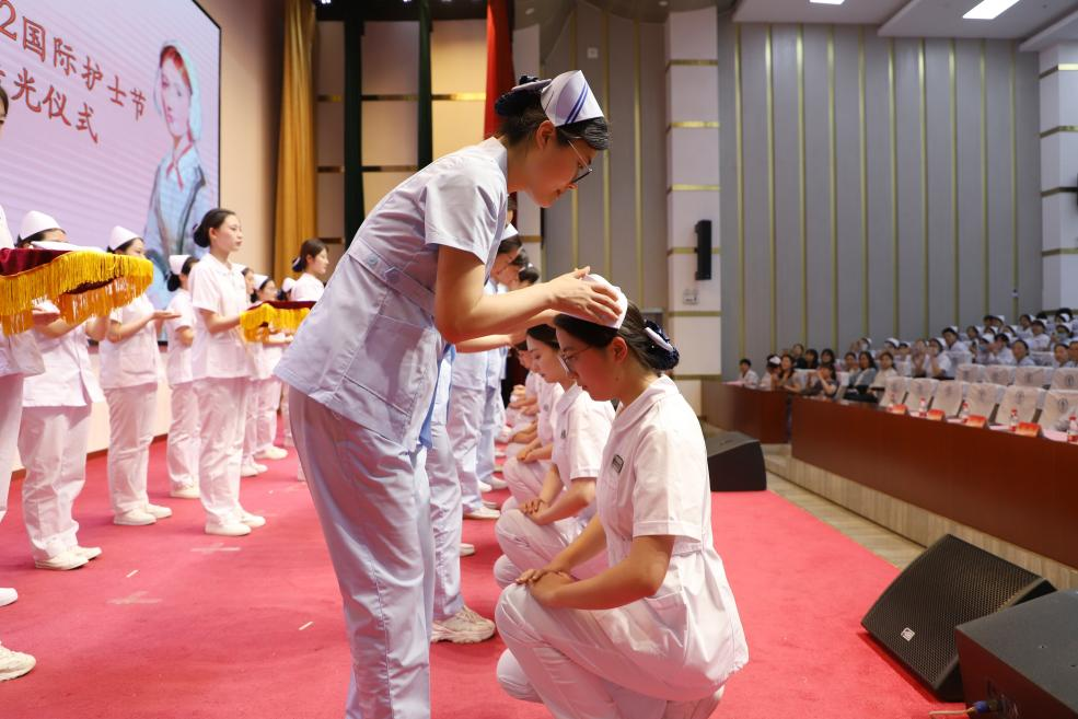 授帽仪式上,护生代表身着统一的护士服,步履坚毅、端庄稳重地走到舞台中央,护理前辈们为护生戴上圣洁的燕帽,点燃手中的红烛。庄严的气氛让现场每个人深感护理工作的崇高和光荣。在铮铮誓言中,同学们表达了自己为护理事业奋斗终身的决心。