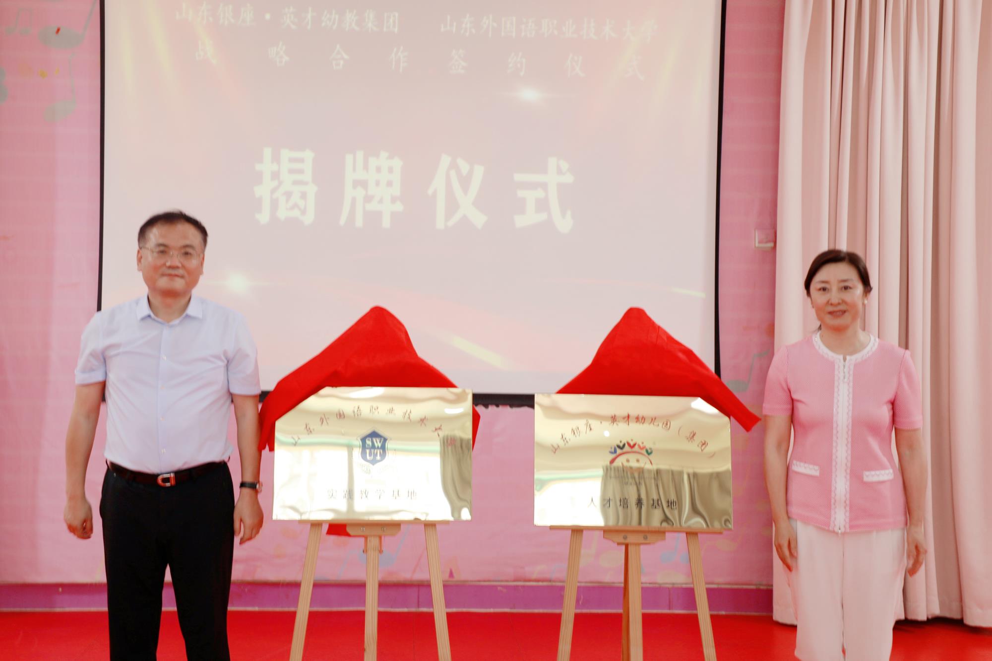 银座幼教党委书记、董事长袁霞与拜文汇共同为“银座幼教人力资源培养基地”和“山东外国语职业技术大学实践教学基地”揭牌。