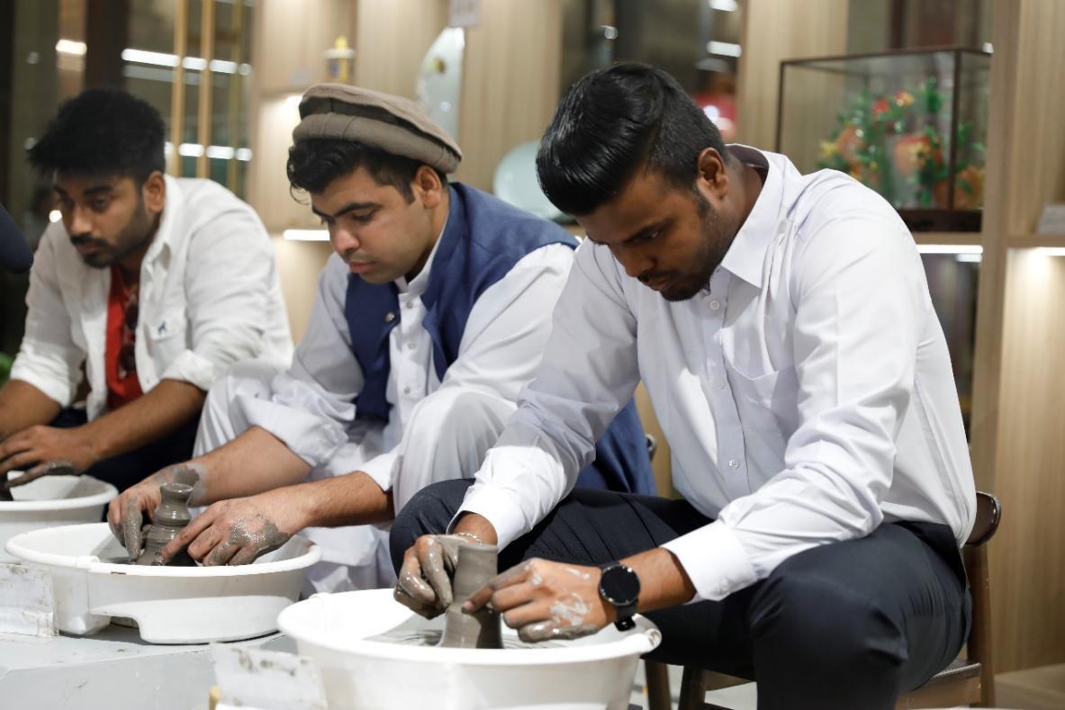 近日,来自巴基斯坦、孟加拉国、也门等国家的16名山东商院外籍师生参观山东老字号暨非遗文化体验馆,在专业老师的指导下,了解并体验陶瓷拉胚、鲁绣、掐丝珐琅、手工和香等非遗项目。