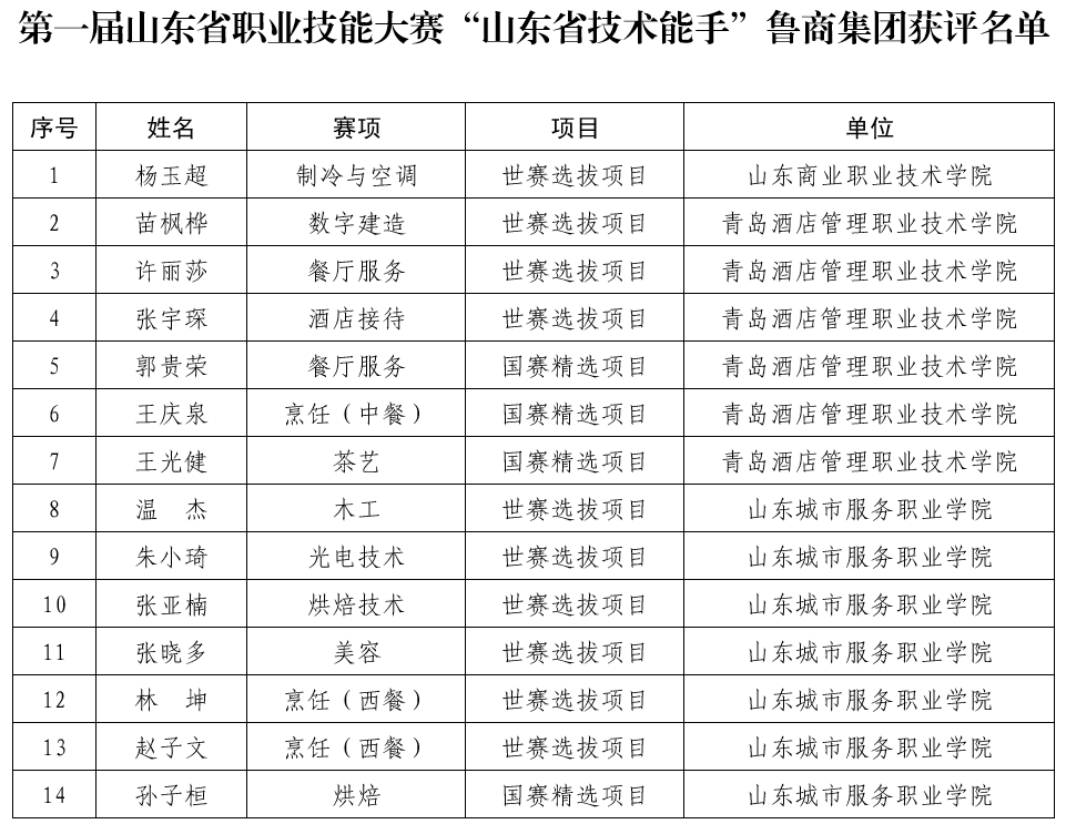 7月14日,省人社厅公布第一届山东省职业技能大赛“山东省技术能手”名单,奇异果体育3所院校共14名师生获评,其中山东商职学院1人、青岛酒店学院6人、山东城市学院7人。