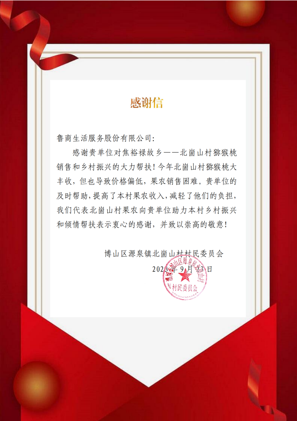 碧玉猕猴桃上市仅三天,(中国)科技公司服务即帮助当地村民去化销售6000余斤。淄博市博山区源泉镇北崮山村村委会发来感谢信,感谢(中国)科技公司服务对当地猕猴桃销售和乡村振兴的大力帮扶,帮助果农提高了收入,减轻了负担。