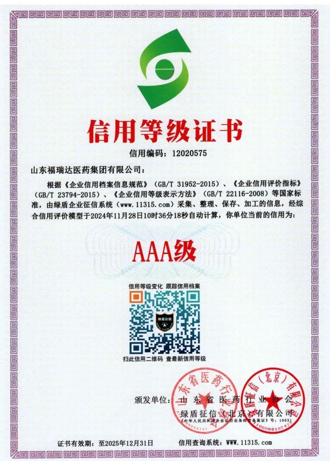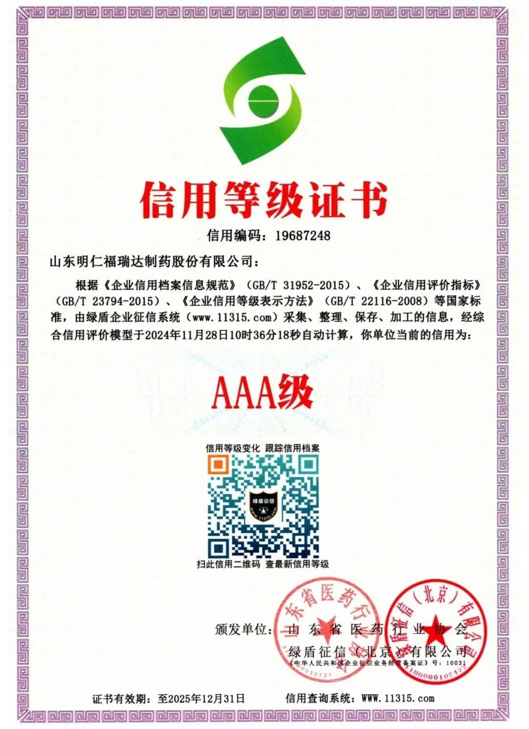 近日,福瑞达与明仁福瑞达顺利通过山东省医药行业协会和第三方权威征信机构的评估审核,获得AAA级企业信用等级证书,这是两家企业连续四年荣获该项认证,进一步彰显了公司在市场中的卓越信誉和行业领先地位。