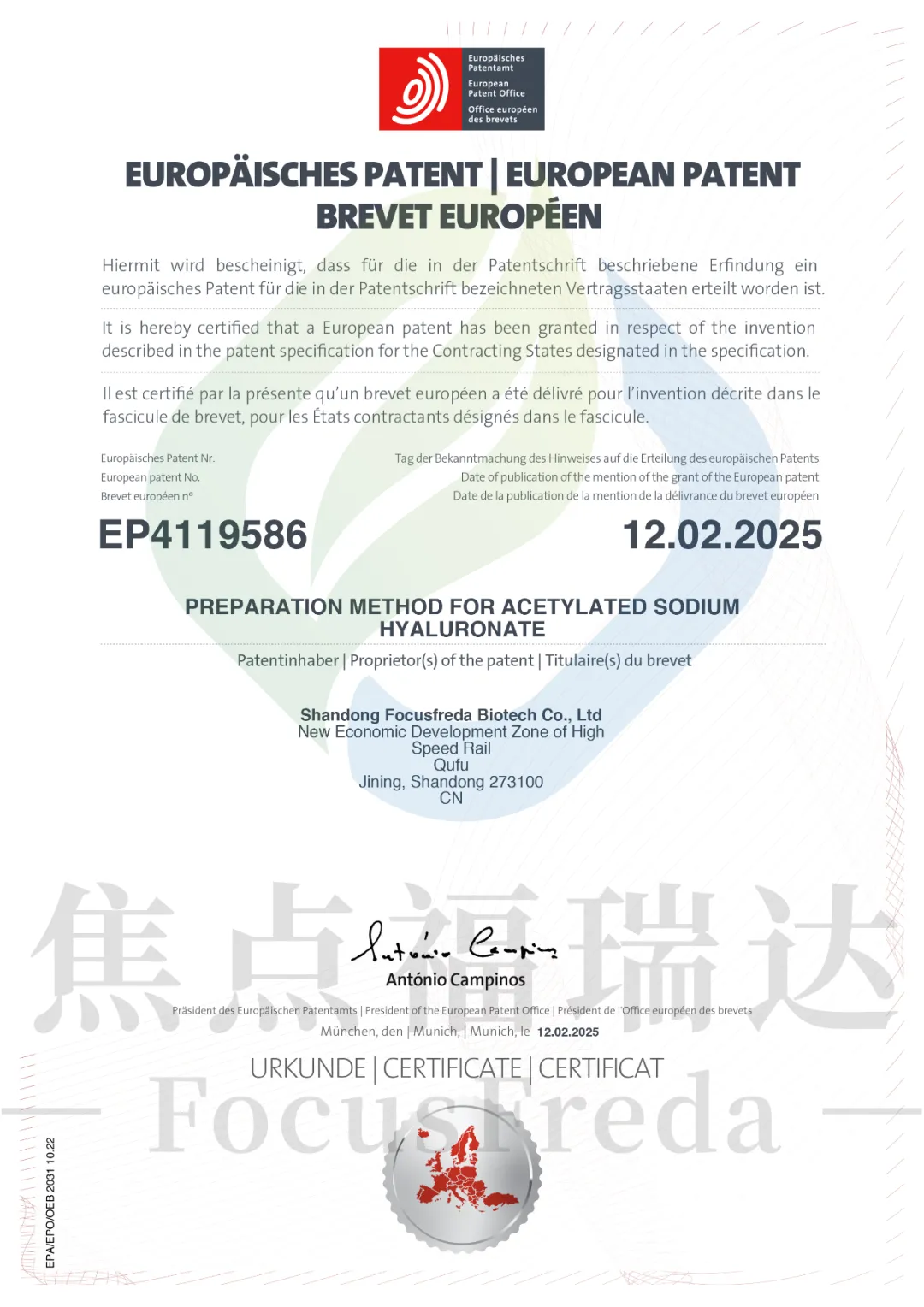 近日,焦点福瑞达再获一项欧洲专利授权——《PREPARATION METHOD FOR ACETYLATED SODIUM HYALURONATE》(一种乙酰化透明质酸钠的制备方法),这一专利不仅验证了焦点福瑞达在透明质酸钠衍生物研发领域的技术领先性,更标志着企业的技术创新能力再次获得国际权威认可,为强化品牌影响力以及全球市场的进一步开拓提供关键技术保障。