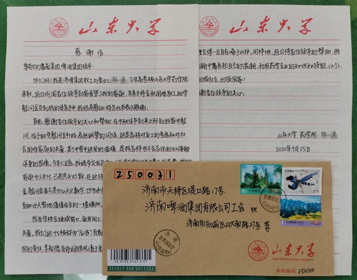 9月27日,济啤集团收到困难职工刘莹女儿从学校寄来的感谢信。