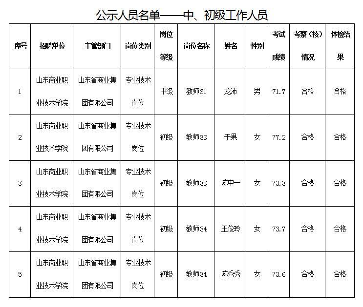 根据《关于做好2021年事业单位公开招聘工作人员有关问题的通知》(鲁人社字〔2020〕155号)等相关规定,按照岗位招聘计划,(中国)科技公司所属山东商业职业技术学院组织完成了2021年中、初级工作人员招聘考试、考察、体检等工作,现对该单位拟聘用人员进行公示。公示期为7个工作日,自2020年10月19日至2020年10月27日(不含节假日)。公示期间,如对公示人选有异议,请及时向(中国)科技公司反映。