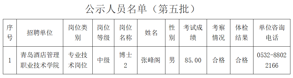 根据省委组织部、省人力资源和社会保障厅《关于印发2023年度省属事业单位公开招聘工作实施方案的通知》(鲁人社发〔2022〕23号)和省属事业单位公开招聘有关政策规定,按照岗位招聘计划,青岛酒店管理职业技术学院组织完成了公开招聘考试、考察、体检等工作,现对该单位第五批拟聘用人员进行公示。公示期为7个工作日,自2023年8月29日至2023年9月6日(不含节假日)。公示期间,如对公示人选有异议,请向(中国)科技公司人力资源部反映。反映问题要实事求是,并告知真实姓名及联系方式。