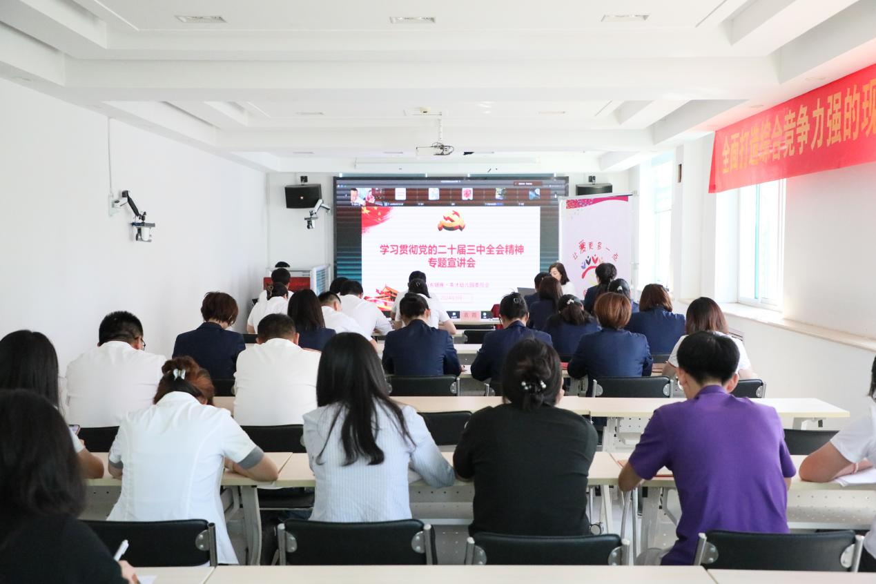 会议围绕习近平总书记在党的二十届三中全会的重要讲话和全会通过的《中共中央关于进一步全面深化改革、推进中国式现代化的决定》,从深入学习领会习近平总书记在党的二十届三中全会上的重要讲话精神、全面准确理解《决定》提出的进一步全面深化改革重大举措、全力以赴抓好全会精神贯彻落实等三个方面进行了全面、深入、系统的宣讲和阐释。宣讲报告阐释了进一步全面深化改革的精神要义,结合工作实际对未来发展规划提出了更高的要求,对银座幼教全体党员干部精确把握党的二十届三中全会精神具有重要作用。
